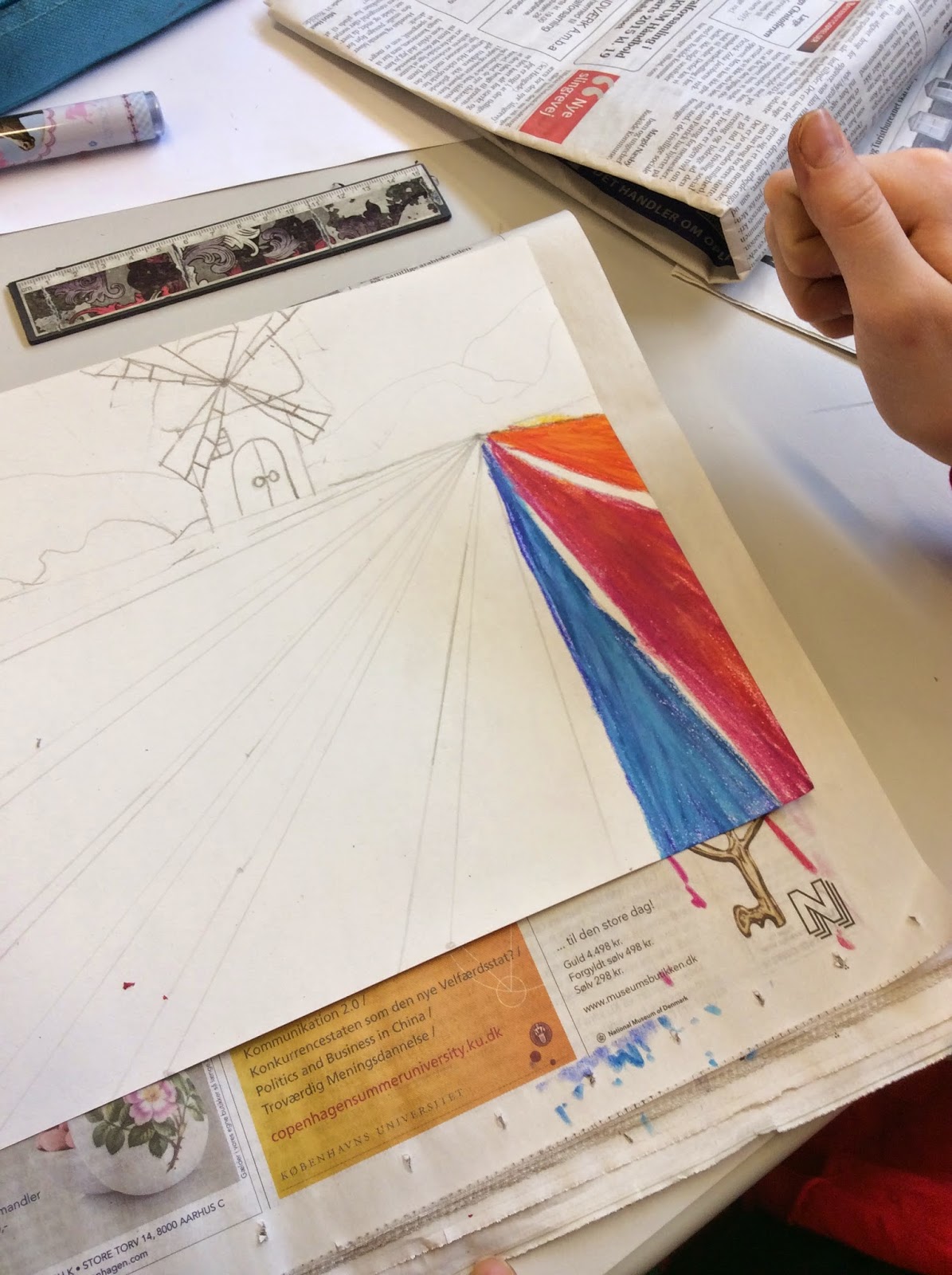 De startede med tegneøvelser, hvor de blev introduceret for horisontlinje og forsvindingspunkt, hvordan man kunne bruge disse til at tegne hjælpelinjer - altså nærmest ren matematik. :-)